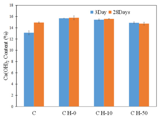 The Ca(OH)2 content of the control cement paste and the pastes with different hydrogels is demonstrated in Figure 7. It is seen that the Ca(OH)2 content of the paste with hydrogels was slightly higher than that of the control cement paste at 3 days, and this is due to increased hydration as a result of additional water provided by the hydrogels into the cement paste. However, at 28 days, the difference in the Ca(OH)2 content was not significant, as seen in Figure 7. It is also noted that the Ca(OH)2 content of the pastes did not seem to show an observable dependence on the concentration of NSi in the hydrogels. It could be stipulated that, in this study, the overall hydration of the pastes at the late age of 28 days was dependent on the overall w/c ratio and did not show sensitivity on the distribution of the water reservoirs in the paste.