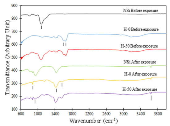Figure 11. FTIR spectra of NSi, H-0, and H-50 before and after exposure to the lime solution with increased pH.