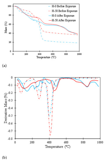 The TGA and derivative TG (DTG) curves of H-0 and H-50 before and after exposure to the lime solution are shown in Figure 12a,b. The TGA curves of H-0 and H-50 before exposure showed a significant reduction in mass between room temperature and 500 °C. Mass loss taking place in the range of 25–200 °C is mainly due to the water evaporation. Two minor peaks can be observed in the DTG curves of H-0 and H-50 before exposure. The mass loss in the range of 220–335 °C, is mainly attributed to the decomposition of the amide monomers in the hydrogels [62]. The second mass loss, which was larger than the first mass loss, occurred in the temperature range of 350–460 °C. This mass loss is attributed to the breakage of the polymer backbone and the imides formed in the first decomposition [62]. It is seen that the mass loss in this temperature range is larger in H-0 than H-50; this is because H-50 is comprised of 66.7% by mass polymer and 33.3% by mass NSi, while H-0 consists of 100% polymer.