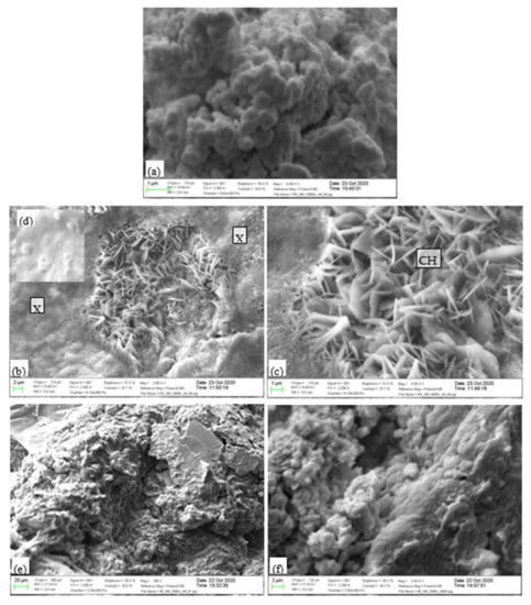 The SEM images of NSi, H-0, and H-50 after exposure to the lime solution are shown in Figure 13. It is seen in Figure 13a that NSi exhibited an agglomeration of globular-shape gel-like structures, with a size in the range of 500 nm, which resembles C-S-H, as demonstrated in previous studies, but with smaller sizes [65]. This is in agreement with the FTIR result that indicated the presence of C-S-H in NSi after exposure to the lime solution. It should be noted that C-S-H can take on different morphologies depending on the synthesis method or reaction time [66]. The morphology of H-0 presented a highly heterogeneous structure as seen in Figure 13b. A region consisting of an aggregation of hexagonal plate-like crystals attributed to Ca(OH)2 is evident in the microstructure of H-0 (Figure 13c). The planar size of the plate-like crystals is in the range of a few tens of micrometers. A continuous region without any distinct features, at least at the imaging resolution captured in this study, is seen, which could be the polymeric portion of the hydrogel. This region is marked with X in Figure 13b. In addition, there are sporadic rhombohedral calcite crystals, as seen in Figure 13d. Figure 13e,f shows the microstructure of H-50 at different magnifications after exposure to the lime solution. Large flake-like features are seen in the microstructure of H-50, which could be related to the polymeric portion of the hydrogel or a polymer-NSi compound. Of particular interest in the microstructure of H-50, are globular-shape gel-like features that showed resemblance to the C-S-H in NSi, as shown in Figure 13a. Overall, the SEM observations seemed to be in relative agreement with the results obtained from FTIR.
