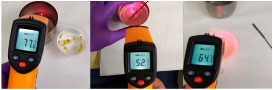 To execute the heating of samples, a magnetic mixer was used with the samples emerged in water, raising the temperature until 80 °C. After a few minutes of heating, the samples were removed from the water, dried, and placed in the spectrophotometer. The test was carried out at approximately 70 °C as a consequence of the thermal losses during the time between the removal from water and the positioning the samples in the equipment.