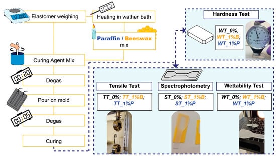 As the paraffin and beeswax do not mix with PDMS at room temperature, it was necessary to heat the base elastomer while the mixture, with 1% of wax addition, was being made. The optimal temperature for mixing was 60 °C. This process is shown in Figure 1. In this case, for each specimen used for tensile, spectrophotometry, and wettability tests, 5.45 g of base polymer, 0.05 g of paraffin or beeswax, and 0.54 g of curing agent were weighed.