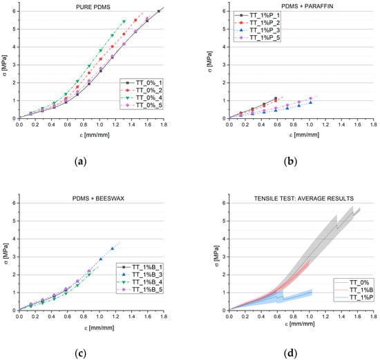 Engineering stress versus engineering strains for (a) pure PDMS (TT_0%); (b) PDMS with paraffin (TT_1%P); (c) PDMS with beeswax (TT_1%B); and (d) mean results and standard deviation.