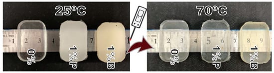 Pure PDMS is a material with high transparency, allowing for great light propagation. With the addition of small amounts of beeswax or paraffin, it is known that the transparency of PDMS can be changed [50], making the composite opaque. Pre-tests demonstrate that above 42 °C, the composite starts to become translucent, and after 64 °C, the appearance was very similar to that of pure PDMS, as shown in Figure 5.