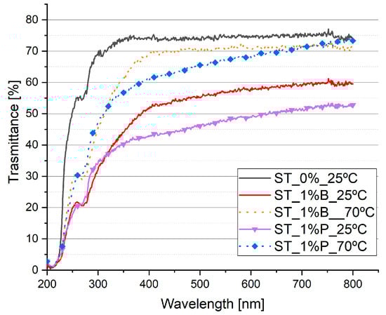 For all spectrophotometry samples, the transmittance increased rapidly until reaching the visible wave spectrum, between 380 and 740 nm, as shown in Figure 6. At this level, the biggest differences were observed between the evaluated groups. Besides, in this region, the pure PDMS had a transmittance of around 75%, and this value remained approximately constant for the different wavelengths. In the studied composites at room temperature, the transmittance was reduced in comparison with the elastomer, and increased as the wavelength increased.