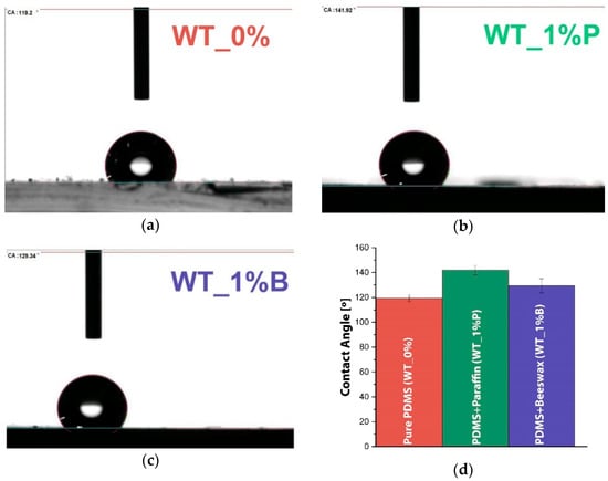 For all the analyzed samples, the material exhibited hydrophobic behavior, with contact angles around 119.2° and 141.9°, for pure PDMS and PDMS with beeswax, respectively. Besides, the additives raised the contact angle, which caused the composite to behave similarly to a superhydrophobic material (with a contact angle higher than 150°). Those changes could have been generated by the reduction of the roughness and superficial energy, two of the main essential parameters for reducing the wettability of a material [44].