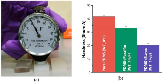 As a result of the hardness test (Figure 8), the hardness average obtained for pure PDMS was 41.7 ± 0.95 Shore A, a value close to that declared by the manufacturer, which is 44 Shore A [55].