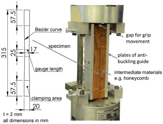 The long gage length set-up with its anti-buckling device and the additional intermediate materials is shown in Figure 1. The tapered specimen (dimensions in Figure 1) is placed between two layers of aramid, cardboard or PTFE material, subsequently referred to as intermediate material (see also Supplementary Material S1). The tapering allows for testing without tabs. The intermediate layers were two aramid honeycomb materials (thickness 15 and 20 mm), cardboard honeycombs (thickness 30 mm) and PTFE film. Characterization of the materials used for the intermediate layer was part of this research in order to use a homogeneous database.