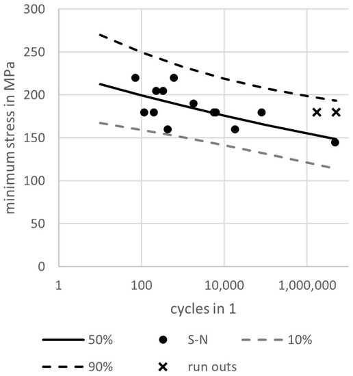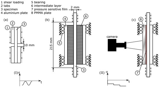 In all LIC tests the first load level is −90 MPa, which was then increased every 10 h by −10 MPa. The first load level is derived from the mean stress of the corresponding S-N curve, which results in similar loading times. A mean stress of −90 MPa leads to approximately 36k cycles. This corresponds to a loading time of about 10 h with 1 Hz. This approach is based on the observed strong fatigue-creep interaction of the laminate under compressive fatigue loading. Under the assumption that the creep failure is also the main cause of failure under compressive fatigue loading, the chosen time increment is the minimum time to cause failure for load levels below −90 MPa. All tests concerning the anti-buckling device (Figure 2b,c) make use of the tapered tensile specimen (TTS) [33].