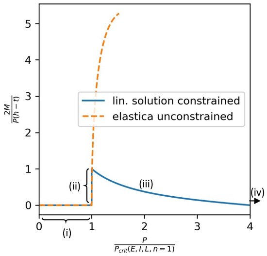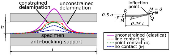 The walls with which the delaminated section interacts, are the intermediate material of the anti-buckling device and the base material of the specimen. Because the initial stiffness (see Figure 10 in the results Section 3.2.1) of all supporting materials is relatively low, and furthermore, the surface of the organo sheet is not perfectly plane an initial, a clearing like configuration is assumed for the delaminated section. Friction is also disregarded, as the models should only provide some insight on how the anti-buckling guides can influence the delamination growth. Under these assumptions, Chai [37] provides a sequential solution for the two dimensional case. Four phases for the delaminated section can be distinguished (i) pre-buckling, (ii) post-buckling with no contact, (iii) post-buckling with point contact and finally, (iv) post-buckling with line contact. For higher loads, additional bifurcations arise. For the first buckling phase (ii) a cosine approximation can be used to describe the shape of the delaminated section. However, as the load remains constant only displacement can be used as controlling parameter. In this buckling phase, no reactional force R exists. Delamination growth is nevertheless possible due to the reactional moment and the in-plane force submitted to the buckled section. In Phase (ii), the reactional moment M is directly correlated to the buckled shape. In Phase (iii), when point contact and a reactional force exist the reactional moment can be calculated by (6). The factor P h 2 gives the maximum reactional moment for the current axial force P and slit width h. The current bending moment is normalized by this factor in order to compare the maximum bending moment for the constrained case to the unconstrained elastica. Figure 4 compares the constrained case in different buckling phases to the unconstrained case. The free body diagram is taken at the inflection point for each of the Phases (ii) to (iv). This leads to the expression below.