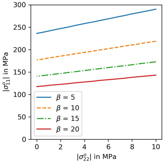 To calculate the necessary propagation stress σ 11 o for different initial misalignment angles β and supporting stresses σ 22 o the crossing point for internal and external work as a function of Φ must be calculated [31]. Kink band propagation in the supported cases is evaluated by either specifying a constant value for σ 22 o or by defining a stiffness for the supporting material Es. This leads to Equation (5), where L is the kink band length.