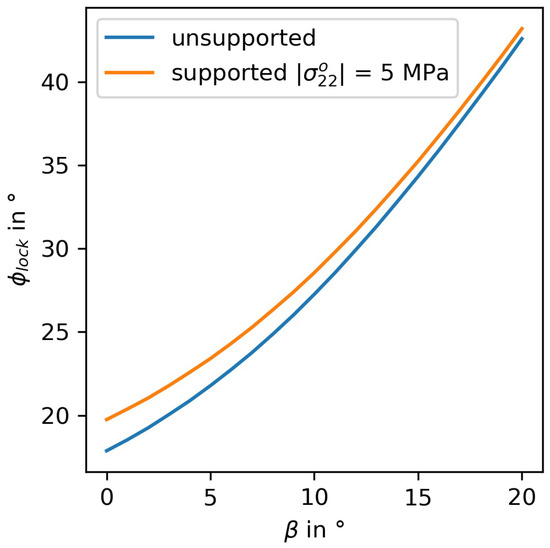However, for large misalignment angels of β = 20° and equally high lock-up angles of 43° a kink band of the length L = 200 µm [40] could theoretically be effected. In order to reach a supporting stress of 5 MPa a stiffness of 37 MPa/mm is necessary. Figure 6 shows the lock-up angle as a function of initial misalignment in the unsupported case and the supported case. The elastically supported case yields lock-up angles between those two lines. It is interesting to note that with decreasing initial misalignment angle β the effect is bigger. In terms of fiber orientation, this means that highly aligned unidirectional materials could potentially be more affected.