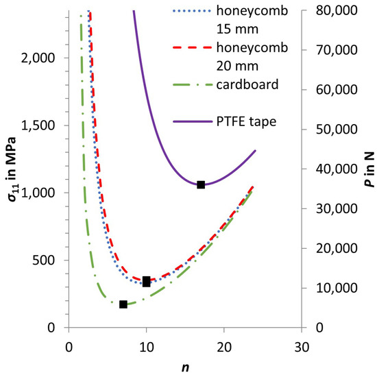 An elastically supported specimen with perfect contact to the intermediate material shows two dependencies with respect to the supporting stiffness. First, with increasing stiffness of the intermediate material, the lowest buckling load is shifted to higher buckling modes (n is increased). Second, the critical buckling load also increases relative to the unsupported case. Figure 9 shows the global buckling load for different buckling orders (n). The buckling loads are calculated with the measured stiffness of the intermediate materials and a length of 200 mm in-between the anti-buckling guide. A hinged case is assumed, because of an unconstrained region (approx. 7.5 mm) above and below the anti-buckling guide. The value of Table 1 for the elastic modulus of the composite material is used.