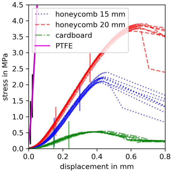 Besides the conventional elastic modulus, a stiffness is evaluated, to account for different thicknesses of the intermediate materials. This measure is defined as elastic modulus divided by thickness, which results in the unit N/mm3. In Figure 10, the vertical lines represent start and end for the linear stiffness and elastic modulus evaluation. The initial stiffness was evaluated for all materials from zero to 0.2% strain. Table 3 summarizes all materials used as intermediate layers and their respective properties. The stiffness of the PTFE material is by far greater compared to the rest of materials under consideration. The elastic modulus in thickness direction should be taken as an estimate because despite machine stiffness compensation of the measured displacement the results can be more affected by other factors compared to the stiffness.