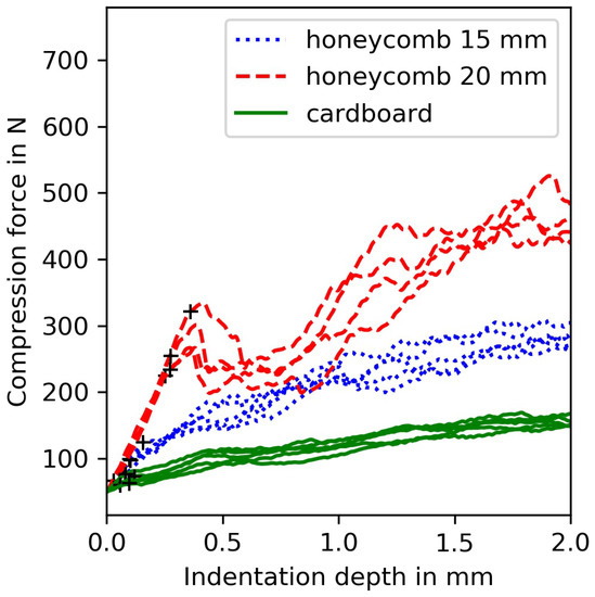 For a better interpretation of the different results in the LIC test, the intermediate layers/materials are also characterized. First, in quasi-static compression tests, and second, in indentation tests with different roller diameters. The quasi-static compression test is performed with a crosshead speed of v = 10%/min on eight samples 50 × 50 × t for the aramid honeycomb materials and 80 × 80 × t for the cardboard material. A larger cross-section of the cardboard material should overcome the coarser material structure (e.g., cell size). The set-up and procedure is based on DIN EN ISO 844. The effect of cell size and material structure is separately evaluated by indentation tests with a cylindrical indenter. To estimate the sensitivity to localized contact different indenter diameters (10, 15, 20 mm) are used. The indentation experiments help to evaluate the effect of the supporting structure (cell size, homogeneity) and its contact with the specimen. All indentation experiments used a maximum indentation depth of 5 mm and a testing speed of 2 mm/min. In order to get an estimate for the elastic properties of the PTFE tape material additional compression tests were performed with small piston diameter 10 mm and a reduced speed of only 0.5 mm/min. A piston instead of compression plates as well as the reduced speed were chosen in order protect the measuring equipment and to minimize alignment errors.