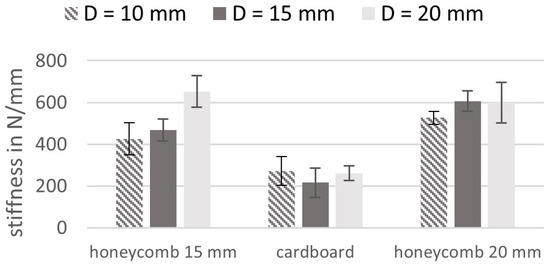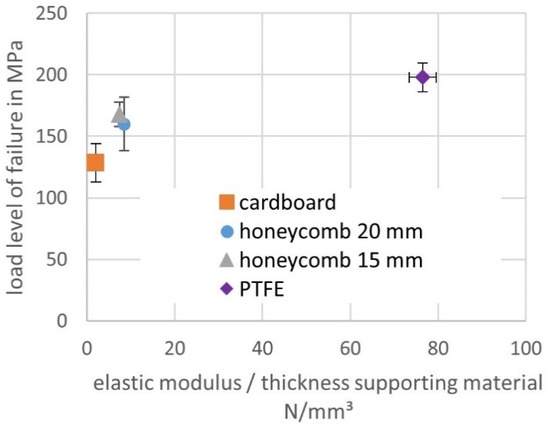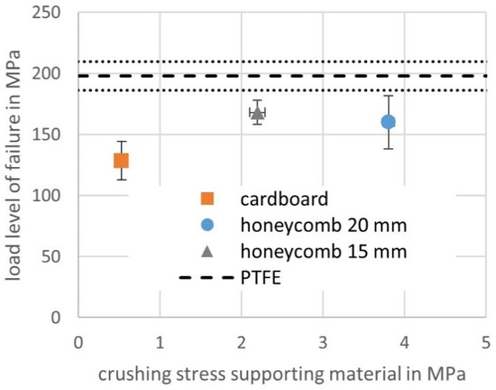 In contrast to the initial stiffness, a possible correlation between the stiffness of the supporting material and the failure type is observed. Instead of comparing the elastic modulus of the supporting materials, it is better to use stiffness (e.g., elastic modulus divided by thickness) as a measure for comparison, because the shape and reactional forces in a slightly buckled column depend on the resulting deformation of the intermediate material and not its strain. A stiffness of 2 N/mm3 or below is not enough to prevent global buckling in the testing configuration despite the predictions for an elastically supported column. One possible explanation for the over predicted buckling load could be that the results in Figure 9 do not incorporate the shear compliance of the laminate. Other likely reasons could be not ideally straight specimens in combination with a low crushing stress of the cardboard honeycombs. The failure load of the LIC test can be correlated with the stiffness of the intermediate material especially for the high differences—Figure 19. The influence of the crushing stress on the failure load level in the LIC can only be evaluated by comparing Figure 19 and Figure 20. The highest load achieved in the LIC test is for both aramid honeycomb materials similar. In terms of crushing stress, a difference would be expected whereas in terms of stiffness not. Furthermore, no crushing is possible for the PTFE film. These observations make the stiffness of the intermediate material in the linear-elastic region of the stress-strain curve the main factor influencing the failure load.
