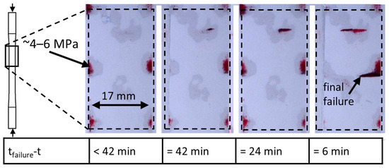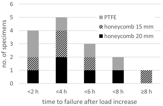 The hypothesis that matrix creep is not negligible is further underlined by the time to failure after increasing the load (Figure 15). If only linear elastic stability failure on different scales would be activated, this would result in failure instantly after or while reaching the next load level. However, the mean time to failure after reaching the next load level is 3.4 h. The distribution of times to failure show a clear tendency to shorter times, but also that the majority of the specimens took more than 2 h to fail after increasing the load. Regarding the different supporting materials, no distinct differences can be seen with respect to this parameter. The specimens show similar pre-failure damage compared to the compression-compression fatigue samples.