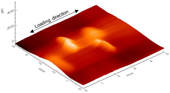 Similar damage modes could be observed in the form of localized buckling over all tests. Figure 17 shows two exemplary specimens. A white light interferometer scan of the same area of the LIC specimen is shown in Figure 18. The calculations in Section 2.3.2 make use of the measured peak height of 0.075 mm. No buckles were visible on the specimen surface before the respective loading.