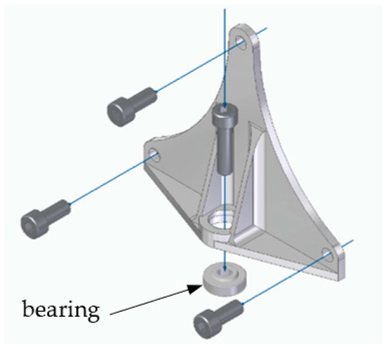 This element is present in both sides of the prototype and is part of its steering system. Its main role is to attach the steering system to the vertical structure of the prototype (Figure 1), through three M5 bolts while allowing wheel rotation (Figure 2). Its location on the prototype is schemed in Figure 1. The rotation movement is achieved by using a radial spherical plain bearing GE5E from SKF® from Portugal [24] placed on the central bearing housing in the component’s bottom part (Figure 2). The connection between the bracket and the remaining part of the steering system is also fixed on the central hole by an M5 bolt placed vertically.