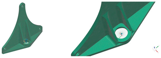 For the FEM of the aluminum component, three-dimensional solid elements were used, and the mechanical properties (Table 1) associated with them were defined as the PSOLID type, once the considered material is a solid. The element mesh was performed with solid elements 3D CTETRA with four nodes because they adapt better to complex geometries. One mm was chosen for the element dimensions so that they would be fitted within the curvature radii. This way, 76,517 elements with 18,851 nodes were used. In addition, RBE3 connector elements were used in the central bearing housing because they are able to make the correct distribution of the applied loads and do not add extra weight or stiffness to the structure. Figure 5 shows the FEM of the original aluminum wheel hub carrier bracket, where it is shown that the connector elements are applied in the central housing.
