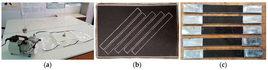 Manufacturing of the basalt fibers (BFRP) composites specimens: (a) vacuum bagging, (b) cut marks of [±45] specimens, and (c) final specimens.