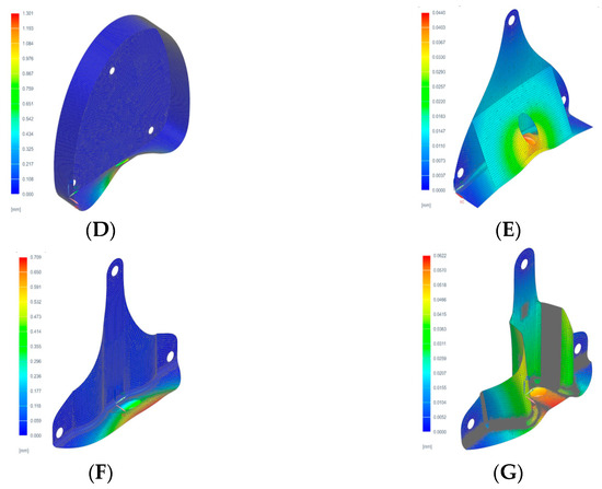 Deformations and stresses in the original aluminum component was obtained to understand how it would affect the performance. Therefore, Figure 7 shows the FEM analysis results for the original aluminum wheel hub carrier bracket subjected to the loads present in Table 2.