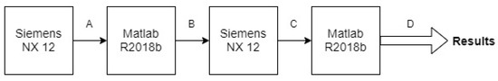 An optimization process of the lay-up regarding the number of layers and ply-stacking was performed. MATLAB® R2018b software was used to develop a model to obtain the best ply-stacking sequence (number of layers and orientation) for the chosen geometry G. The model worked as an interaction with the finite element solver, associated with a commercial software called Nastran. The optimization model works together with FEM to evaluate the possible ply-stacking sequence, as shown in Figure 10. MATLAB reads the variables from a text file (*.dat) generated by the Siemens NX 12 (Figure 10A). The file is read, and the location related to the stacking sequence is found, and then changed (Figure 10B). The file is saved, and the finite element solver is initialized (Figure 10C). Once the simulation is over, the MATLAB program reads the output file generated by Siemens NX 12 (*.f06), and locates the required data, which is the weight and the maximum deformation verified in the structure (Figure 10D).