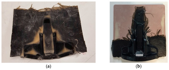 Two parts with the same mold were fabricated with hand-lay-up by a vacuum bag. The first one, component A (Figure 12a), was produced with 10 basalt fiber layers with 150 × 150 mm. The second part, component B (Figure 12b), was fabricated with 10 basalt fiber layers with the geometry obtained by Siemens NX 12, i.e., the software calculated the 2D geometry from a 3D model of the component. For both cases, one layer of perforated Teflon® film and two layers of breather in the lay-up were also used.