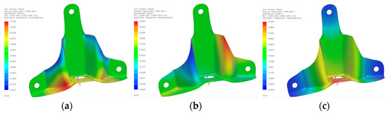 Deformation results obtained from the FEM are shown in Figure 16 along the three axes (x, y, and z). From the analysis of this figure, it is possible to verify that the higher deformation occurs in the zz axis (Figure 16c). This is expected as the largest applied load was, according to the vertical axis. The 0.095 mm deformation occurs in the central bearing housing in the component’s bottom part for a maximum load of 4.770 kN.