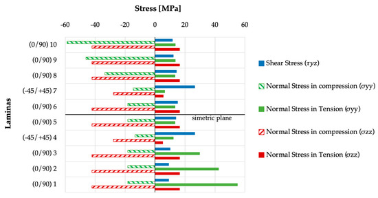 In Figure 17, the laminas numbered from 1 to 10 correspond to the stacking obtained from the optimization process from which the component was manufactured [(0/90)3/(−45/+45)/(0/90)]s. Analyzing the normal stresses by σzz is understandable that there is a great contribution of the 0/90 plies (1, 2, 3, 5, 6, 8, 9, and 10), contrary to the ±45 laminas (4 and 7), being verified as a reduction of 66.12% in tension and 33.92% in the compression.