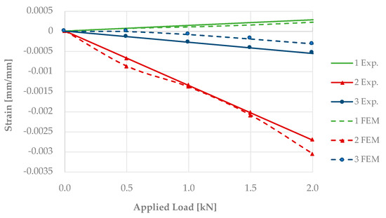 Figure 18 displays the strain results from the experimental tests (Exp.), with continuous lines, and from the finite element method (FEM) with dashed lines. The strains were obtained from the three strain gauges shown previously in Figure 13b.
