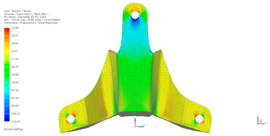 To develop the BFRP wheel hub carrier bracket by FEM, the mesh was divided into three different zones, represented by green in Figure 15 and linked using Stitch Edge command from Siemens NX software. It was used as a 2D CQUAD4 quadrangular mesh with 6397 elements and 6681 nodes and a SOL101 Linear Statics analysis was also conducted.