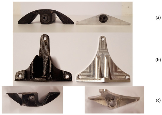 New BFRP component vs. original aluminum component: (a) Bottom view. (b) Frontal view. (c) Top view.
