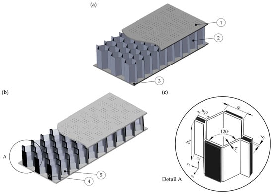 The structural concept of configuration 4 was used to realize advanced hybrid acoustic liner with partially fiber-reinforced support structures (Figure 1b). The flexible wall areas were made of thermoplastic polyurethane (TPU) and the stiff wall areas were made of a carbon fiber-reinforced polyamide 6 tape. For the manufacturing, the concept of folding thermoplastic honeycomb cores structures introduced by Kucher et al. [] is targeted. In this context, the manufacturing and design concept of a composite lattice truss structure presented by Li et al. [] indicates an alternative method for realizing the support structure of configuration 4.