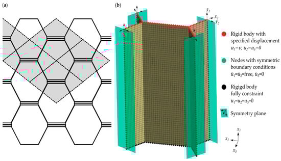 The displacement in all other directions (global - and -directions) was fixed. A fixation in all directions was realized at the lower edges of the core. Depending on the desired manufacturing process, the tapes are either welded or glued to the honeycombs. Therefore, the connection between the adjacent shells of the model was set as a compound. In order to represent the periodicity of the structure, boundary conditions can be introduced at the section planes of the honeycomb edges (in the shell geometry in the form of section edges). For the further numerical analyses, symmetry constraints perpendicular to the section planes of the free-standing cell walls were applied by fixing the displacement in the -direction and setting the displacement in each transverse direction as free. This approach has proven to be useful in previous investigations with respect to the realistic representation of the structural failure [,,].