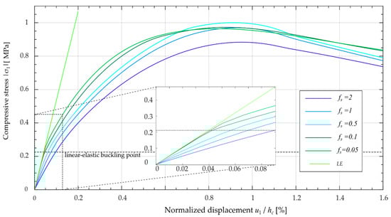 It can be observed that the stress increase was initially lower with a larger , since the buckling and thus the instability of the structure was already further progressed. Thus, less force had to be applied to compress the structure. The two curves correspond to the lowest factor = 0.1 and 0.05 ran up to the linear-elastic buckling point close to the geometric-linear solution. An initially analogous behavior also occurs in the study of Jang et al. [], where the buckling behavior of over expanded metallic honeycomb cores is investigated. Despite the lower degree of geometric imperfection, the two curves with the lowest reached comparatively lower stress maxima. For the present study, the scaling factor was set to = 0.1 according to the similarity to the force-displacement curve from the study by Jang et al. [].