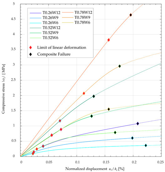 The failure of the structure, represented by black markers, occurs at a displacement range of 0.13% to 0.22% of the core height. This corresponds to a deformation in -direction of 0.39 mm and 0.66 mm, respectively. Compressive strengths of the core of 0.36 MPa to 4.6 MPa are achieved. The red marks represent the point where the deviation from the initial linear increase of the stress/compression ratio reaches the threshold of 5%. At this point, the limit of linear elastic increase of the deformation is approximately reached.