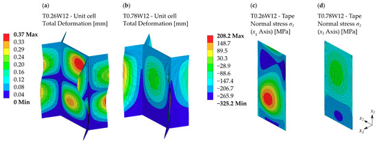 Total deformation of the unit cell of the configurations (a) T0.26W12 and (b) T0.78W12 and the stress state (-direction) of the tape at the point of failure of the configurations (c) T0.26W12 and (d) T0.78W12 at a deformation-scaling factor of 6.0.