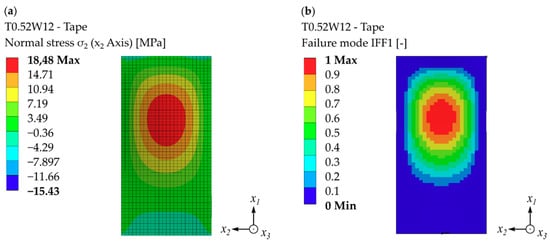 (a) Plot of the distribution of stresses of the tape configuration T0.56W12 and (b) the inter-fiber tensile failure mode (IFF1) for all elements of the tape at the point of failure.