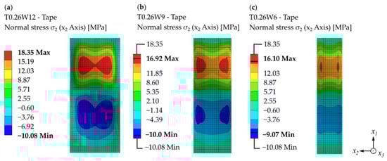 Comparison of the normal stress distribution of the three tape widths (a) 12 mm, (b) 9 mm and (c) 6 mm with a tape thickness of 0.26 mm at the point of failure.