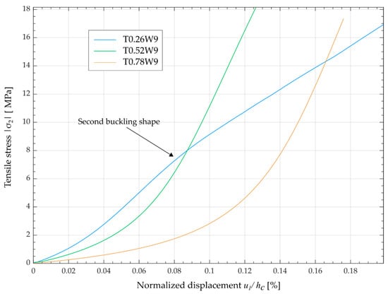 When looking at the failure modes (see Table 4), it is noticeable that the configuration with the thickness of 0.52 mm fails for all three widths due to inter-fiber tensile failure. In contrast, the thicker and thinner configurations fail only in the widest configuration due to inter-fiber tensile failure caused by different buckling shapes. To illustrate the correlation, Figure 8 shows the variation of the stresses versus the applied normalized displacement in the -direction, for three configurations of the same tape width. It is clear that as the tape width decreases, the increase in stress becomes more progressive.