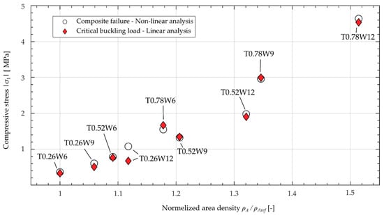 Comparison of calculated composite failure of the nonlinear analysis and the critical buckling load of the linear analysis over the normalized area density.
