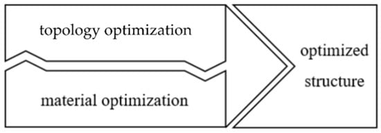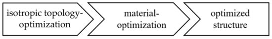 Typical procedure for the optimization of hybrid structures reinforced with cFRP []. In a first step, isotropic topology optimization is performed. In a second step, the orientation of the anisotropic material within the resulting volume is optimized.