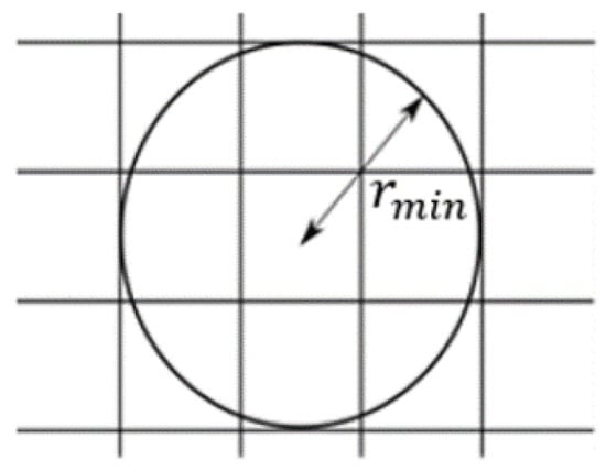 To avoid numerical instabilities, the calculated sensitivities are spatially filtered. For this purpose, there are several approaches []. In the following, the popular approach of Sigmund [] is used. If element i lies within the filter-radius as displayed in Figure 3 the filtered sensitivities are calculated according to Equation (5).