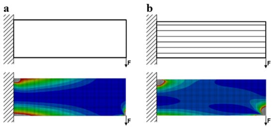 A more precise option is stress analysis. Load paths can be defined using the finite element method (FEM). However, there is no generally valid definition of load paths []. Marhadi and Venkataraman summarize some approaches using two-dimensional continuum structures as an example. A common approach is the use of topology optimization to identify highly stressed areas. These areas are then reinforced with a high strength and/or high stiffness material within the hybrid structure.