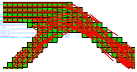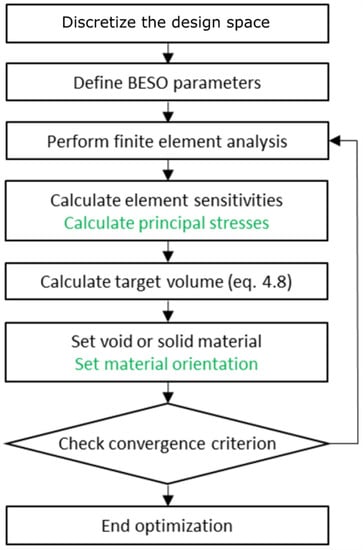 Approaches that combine material orientation in the direction of the principal stresses with the BESO method are already known from Safonov [] and Yan []. Here an additional step is integrated into the BESO algorithm, which adapts the fiber-angle to the state of stress as shown in Figure 7 compared to Figure 4.