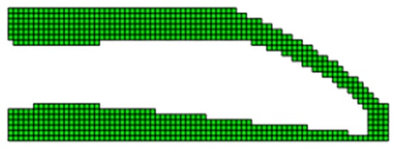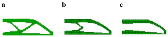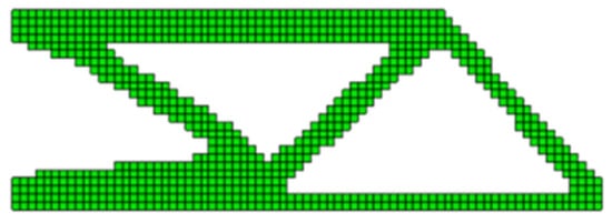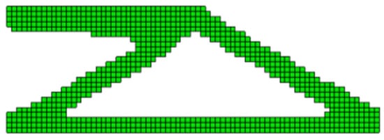 In this paper, the BESO method is implemented because of its high-quality topology solutions, computational efficiency and ease of implementation []. It is explained in detail below. In order to maximize the stiffness of the structure, the strain energy must be minimized. This is expressed in Equation (1) where compliance is the objective function that should be minimized. Here f and u are the applied force and displacement vectors.