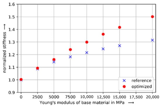 The influence of the stiffness of the base material will be quantitatively estimated in the following. Comparative calculations with different stiffnesses for the base material are presented. The stiffness of the optimized structure is calculated for a base material with various elastic moduli, in order to evaluate the influence on the stiffness. The results are compared to the stiffness of the reference optimization result in Figure 11. To ensure comparability, after the optimization of the reference for isotropic material, a fiber angle optimization is performed and the anisotropic material is assigned. Additionally, the material properties of the base material of the corresponding optimization calculation are assigned.
