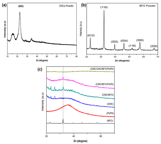 XRD diffractogram of (a) CNCs powder, (b) BFO powder, (c) PoPD powder, CMC film, CMC/BFO, CMC/BFO/PoPD, and CMC/CNCMCC/BFO/PoPD.