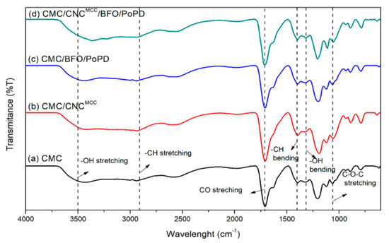ATR-FTIR spectrum of (a) CMC, (b) CMC/CNCMCC, (c) CMC/BFO/PoPD, and (d) CMC/CNCMCC/BFO/PoPD composite film.